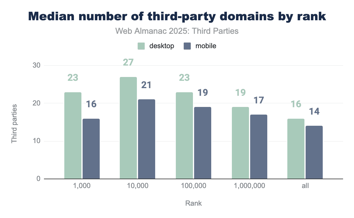 Low-ranked websites load more third-party requests. The top 1,000 have a median of 129 requests on desktop and 106 on mobile, compared to 83 on desktop and 79 on mobile across all sites.